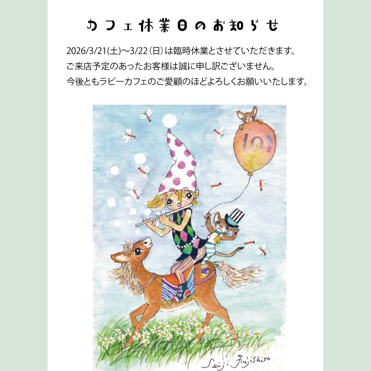 03Mar2026 休業日のお知らせ Tweet Share 休業日のお知らせ 画像にございますお日にち(3/21-3/22)に休業させていただきます。 ご来店予定のあったお客様、誠に申し訳ございません。 引き続きラ・ビーカフェのご愛顧のほどよろしくお願いいたします。 Tweet Share 「開催予定」 最近のお知らせ一覧お知らせ一覧 「開催予定」 2026.02.18 新規入会受付停止のお知らせ 2026.01.14 【訂正】臨時休業日のお知らせ 2025.12.16 休業日のお知らせ 2025.12.01 休業日のお知らせ 2025.09.12
